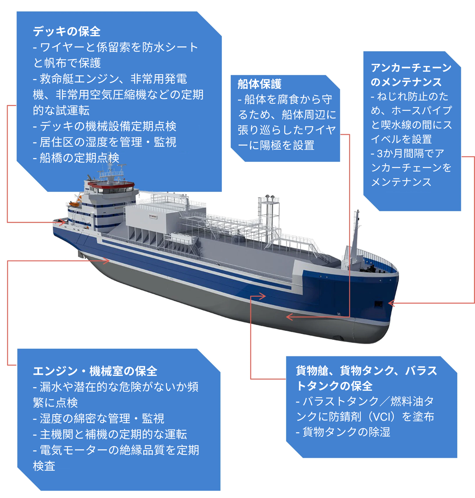 当社では係船中の船舶保守・メンテナンス作業を重視しています。この作業は運航再開後に最適な性能を維持するために不可欠です。