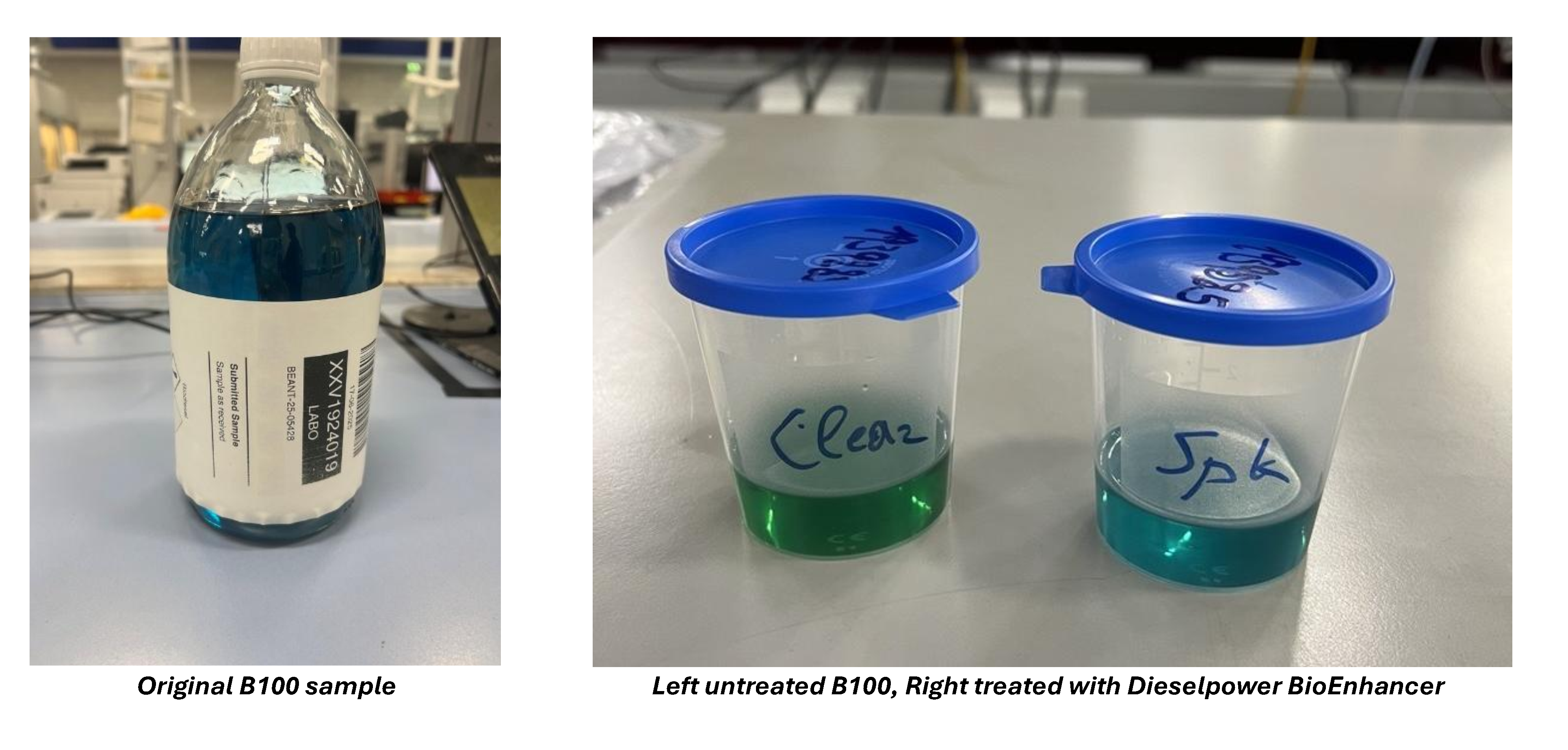 - Treated sample: B100 biodiesel additised by Dieselpower BioEnhancer