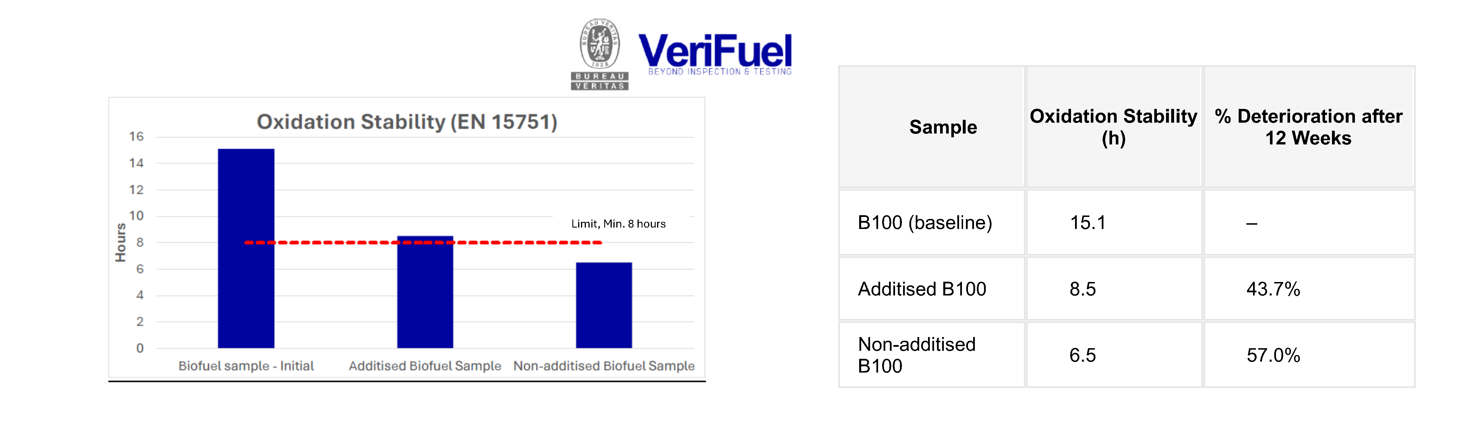 After ageing, the additised fuel maintained an oxidation stability value approximately 31% higher than the untreated fuel and remained above the EN 15751 minimum requirement of 8 hours, whereas the untreated sample measured 6.5 hours, falling below the EN 15751 minimum requirement and rendering the fuel out of specification.