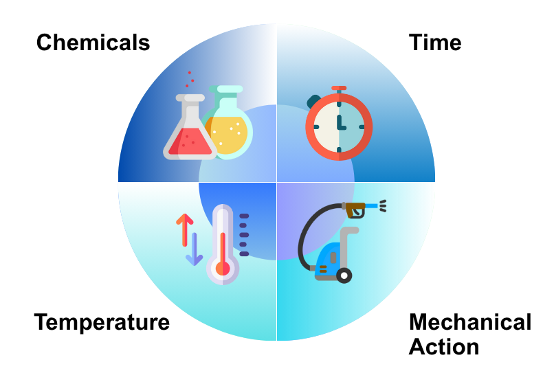 In the 1950s, chemical engineer Herbert Sinner described a theory that has since become the foundation of modern cleaning science: Sinner's Circle. It identifies four interdependent factors that influence cleaning effectiveness:
